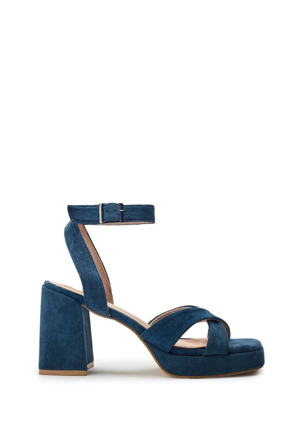 Elegant blue suede sandals by b.soleful. Featuring a high block heel, crisscross straps, and a silver buckle. Perfect for evening events or special occasions.