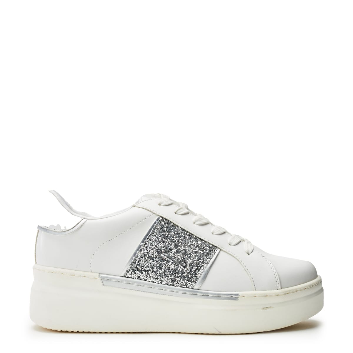 Elegant silver trainers with a sparkling design stripe and a low wedge heeled platform for a stylish and comfortable step. Ideal for casual outings.