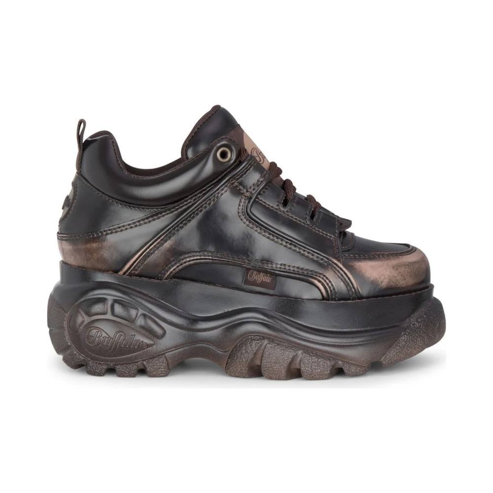 Stylish Buffalo 1339-14 VNTG women's platform trainers in brown. These lace-up sneakers feature vegan box leather, offering the sleek look of genuine leather while remaining cruelty-free and durable. The distinctive chunky platform sole provides a subtle lift, a confident silhouette, and long-lasting comfort.