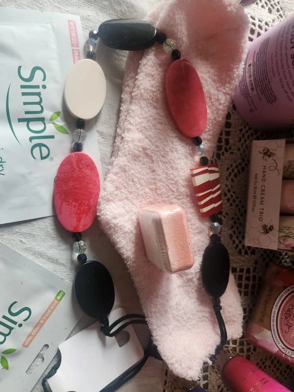 Luxurious Christmas gift bundle for women, perfect for holiday gifting. Includes a variety of pampering items such as fleece socks, necklace, and hand and foot creams.