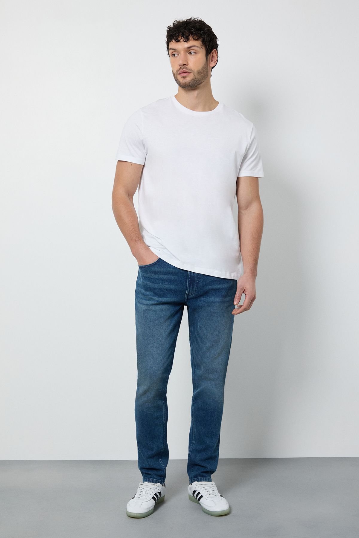 Pair with a white crew neck t-shirt and white trainers for a casual yet polished look.