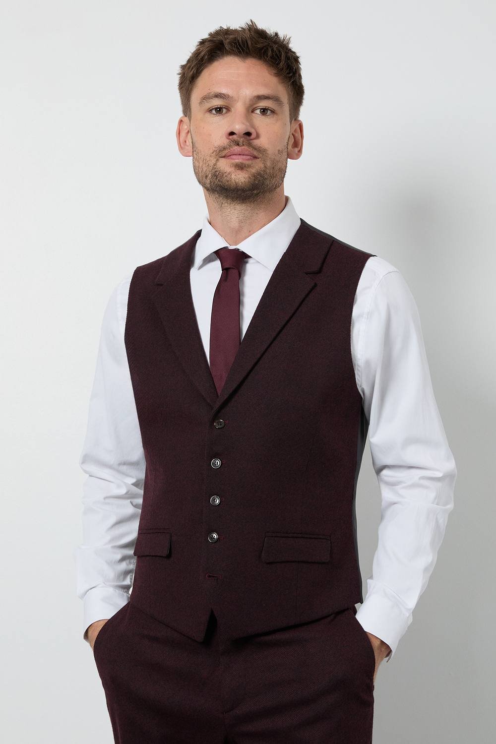 The Burton Men's Burgundy Tweed Look Waistcoat is ideal for formal, business, casual.