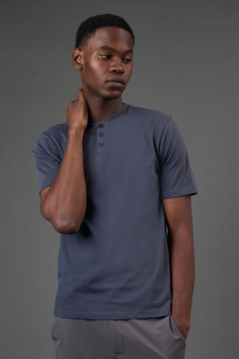 The Burton Men's Dark Blue Grandad Neck T-Shirt is ideal for casual, everyday, smart-casual.