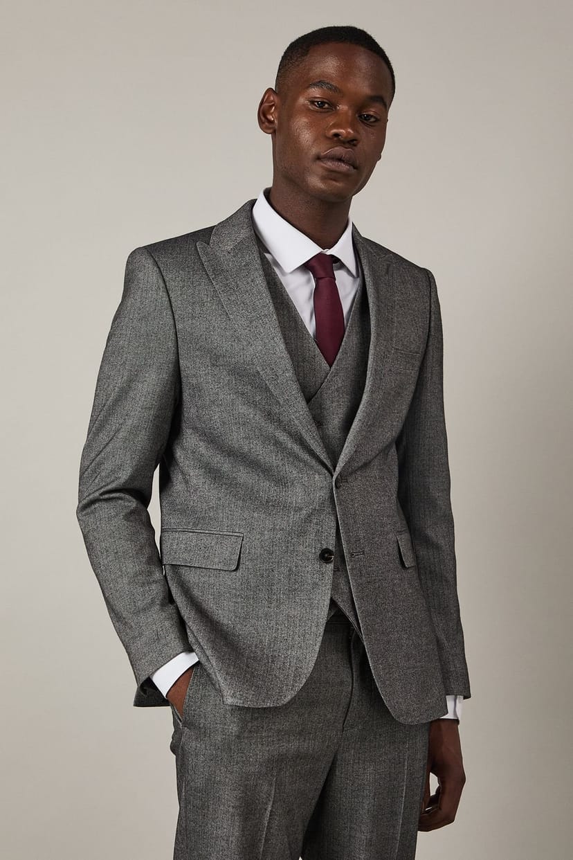 The Burton Men's Grey Tweed Herringbone Slim Fit Jacket is made from tweed.