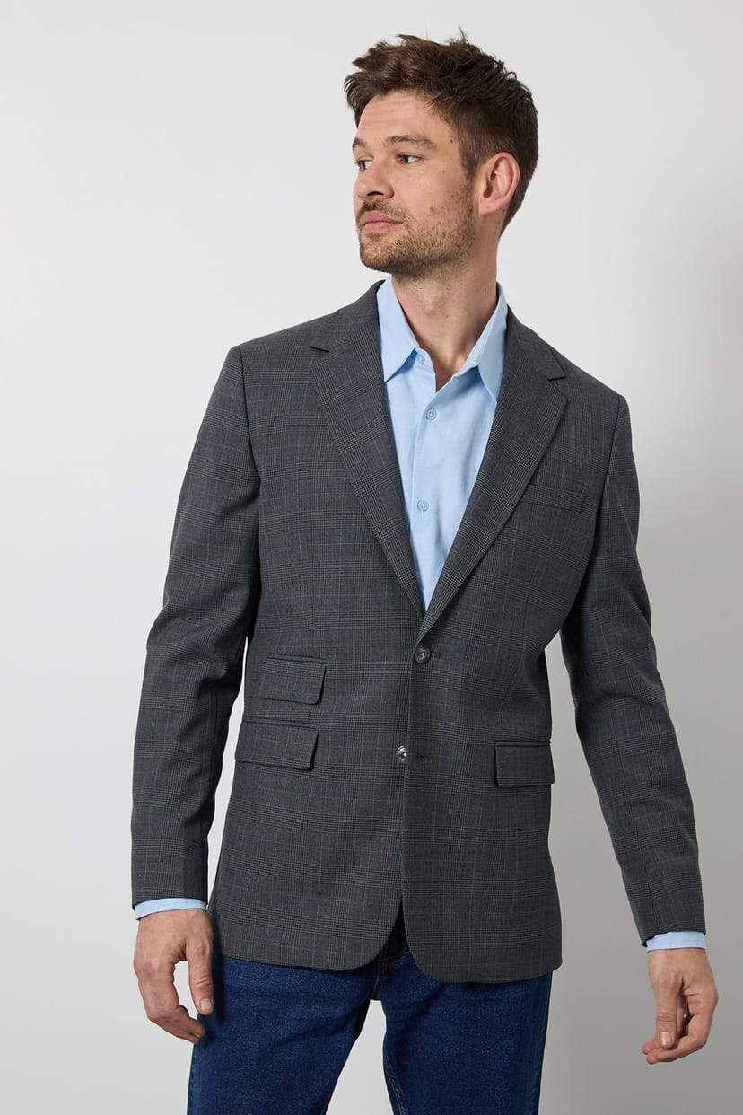 Sophisticated pow check pattern blazer in grey wool-rich blend. Features classic notch lapels and two-button fastening. Includes double flap pockets for practicality. Perfect for transitioning from formal to smart-casual settings.