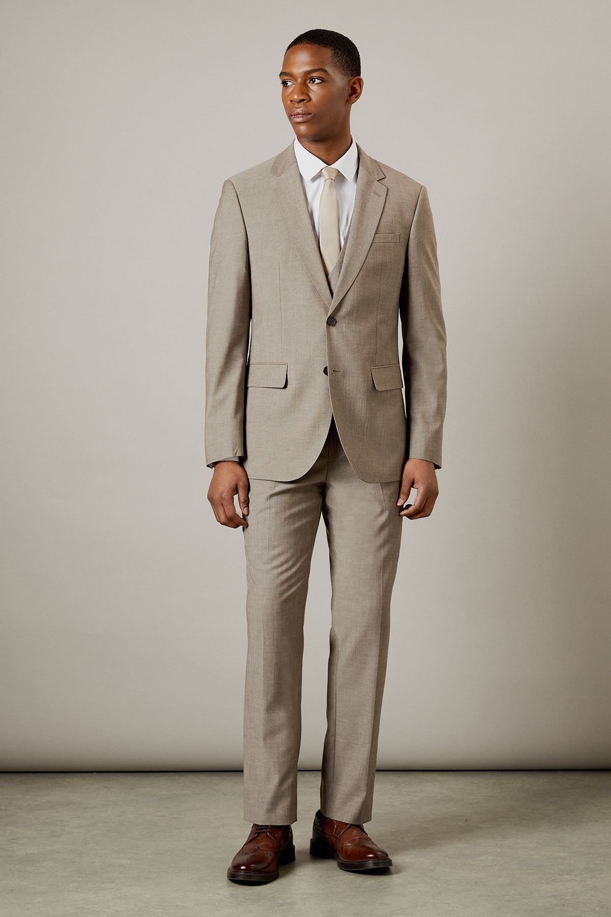 Stylish light brown tailored fit suit jacket by Burton. Features notched lapels, two-button front closure, and flap pockets. The four-button cuffs add a polished finish. Ideal for formal and business occasions.