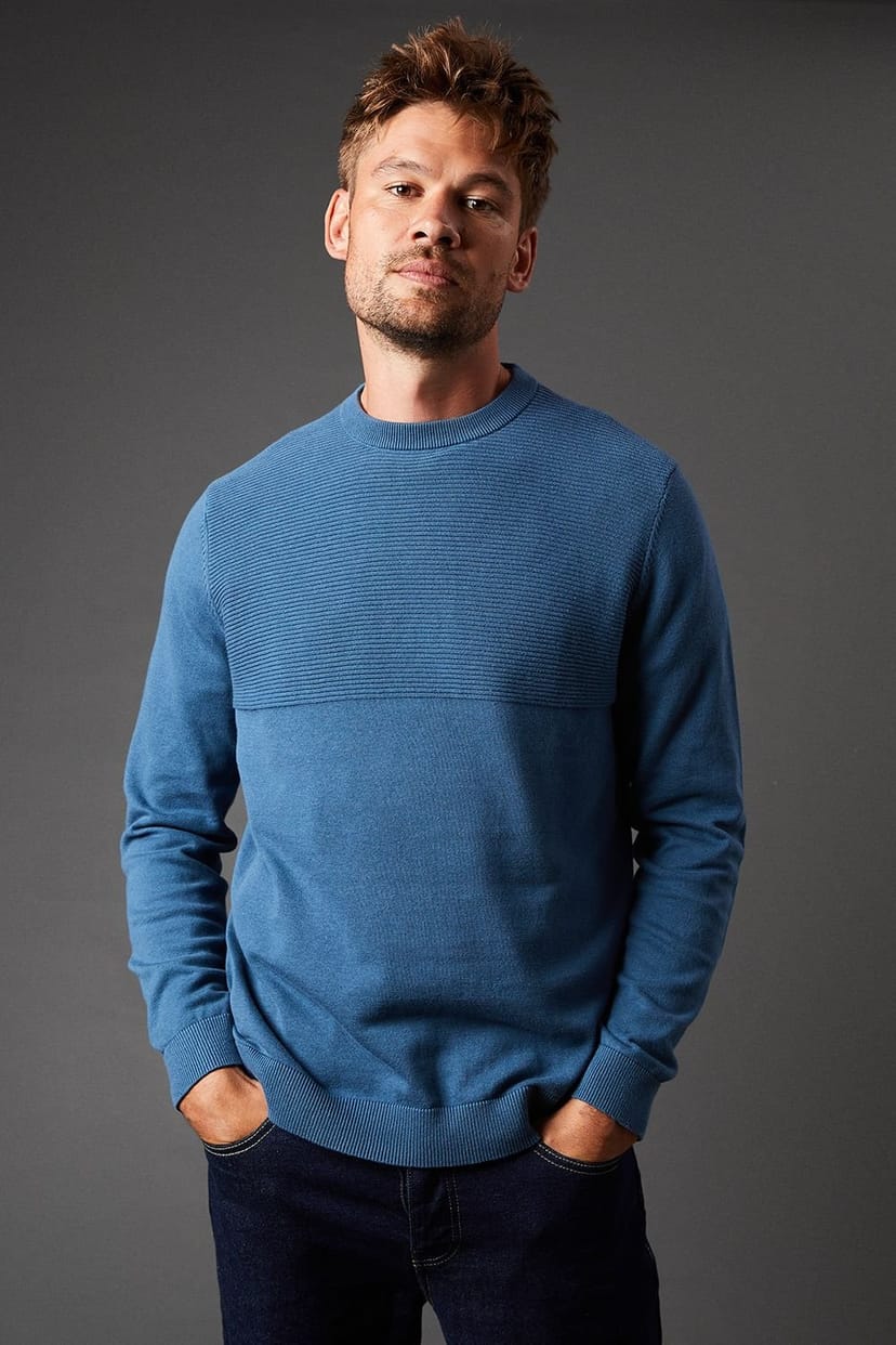 Distinctive link yoke design for a modern twist on a classic crew neck for timeless appeal. Solid colour for easy styling. Relaxed fit through the body for comfort.