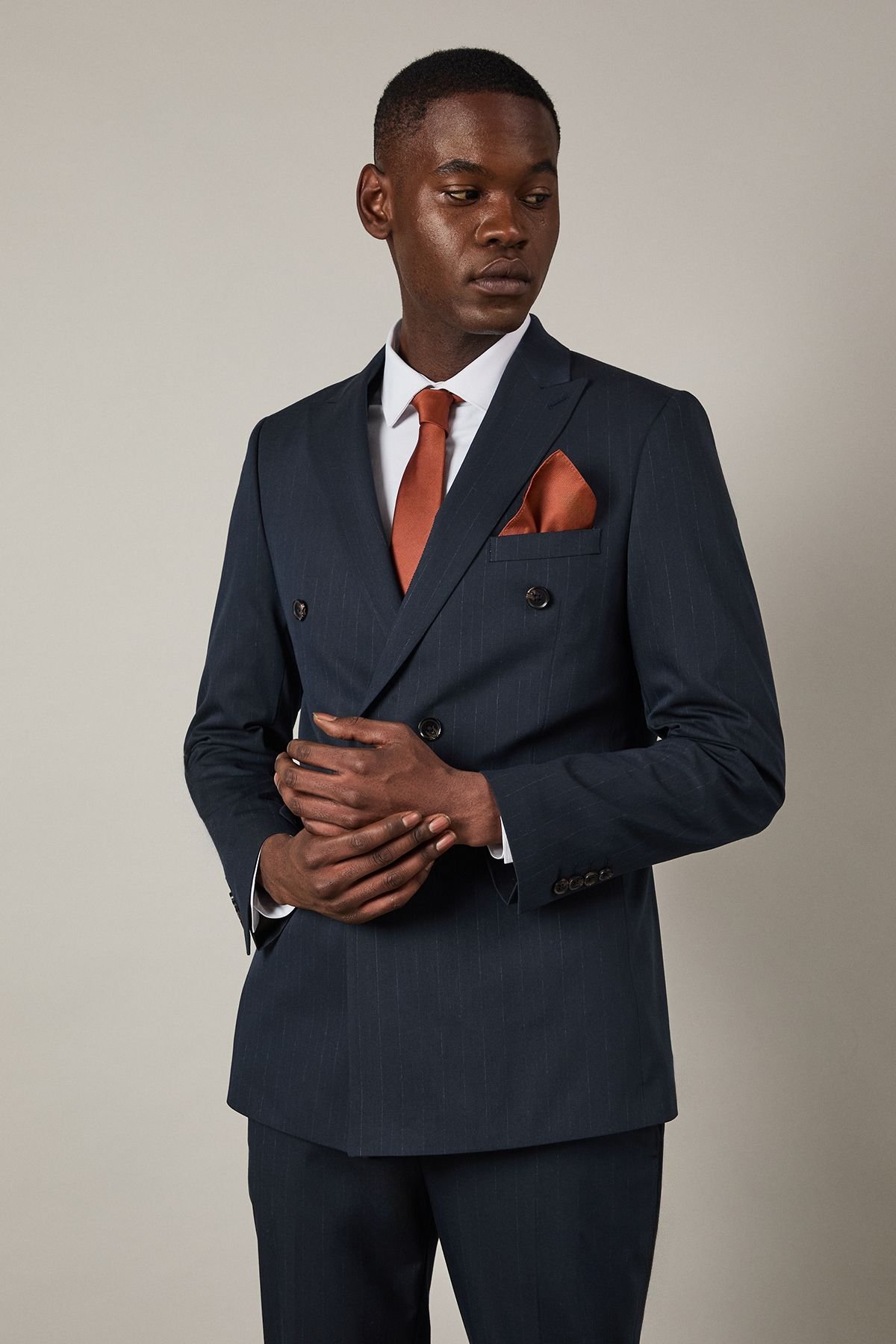 The Burton Men's Navy Pinstripe Double Breasted Jacket is ideal for business, formal, evening.
