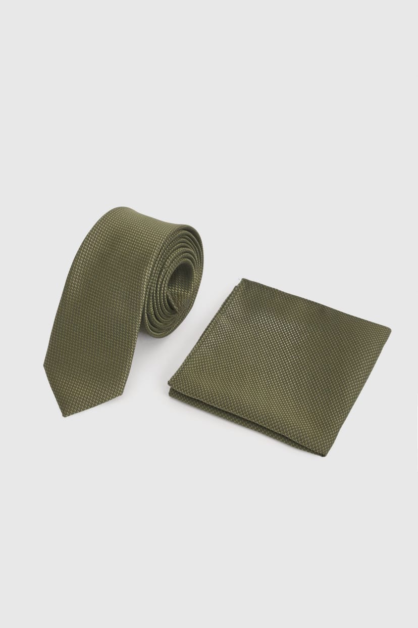 Classic olive textured tie and pocket square set for formal styling. Features a subtle micro-pattern for added depth and interest. Perfect for various collar styles and versatile enough to complement both light and dark suits.