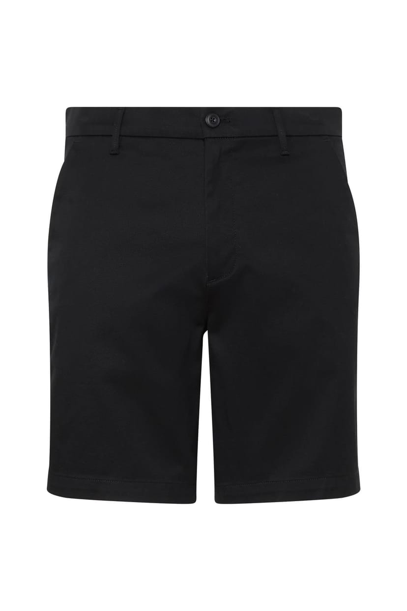 Sleek black cotton shorts with a straight fit and 9-inch length. Designed for a smart-casual look, featuring a button and zip fastening with belt loops for a customisable fit.