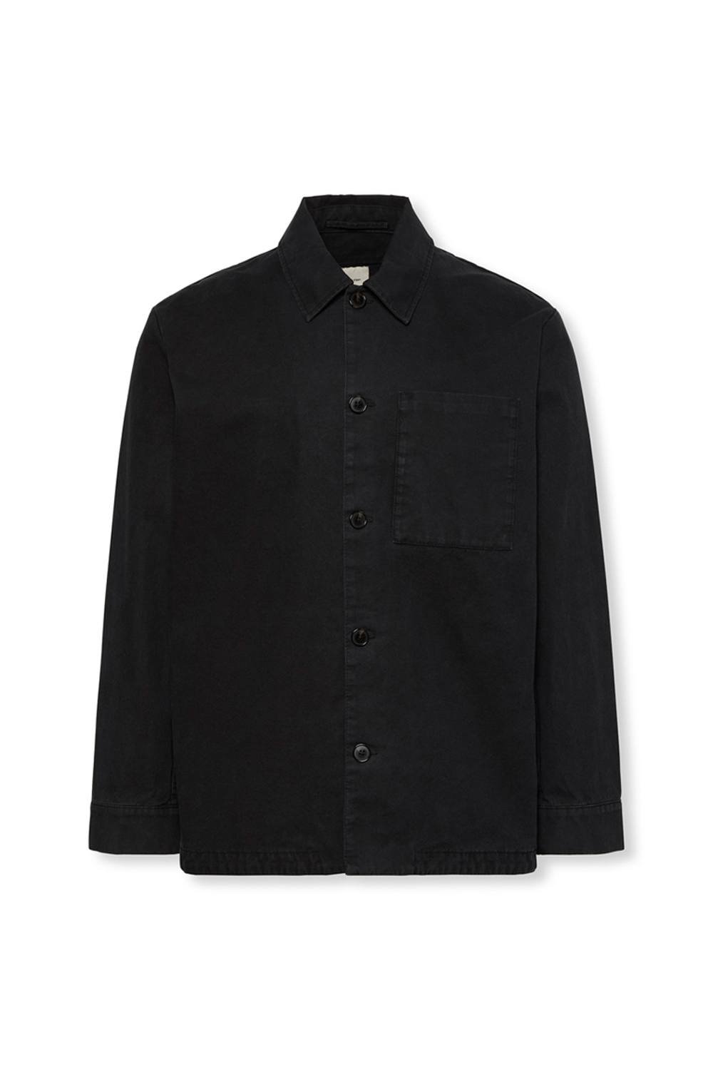 Versatile hybrid shirt jacket by Calvin Klein in black washed cotton twill. Features a button-through front and a practical chest pocket. Designed for layered styling and everyday comfort.