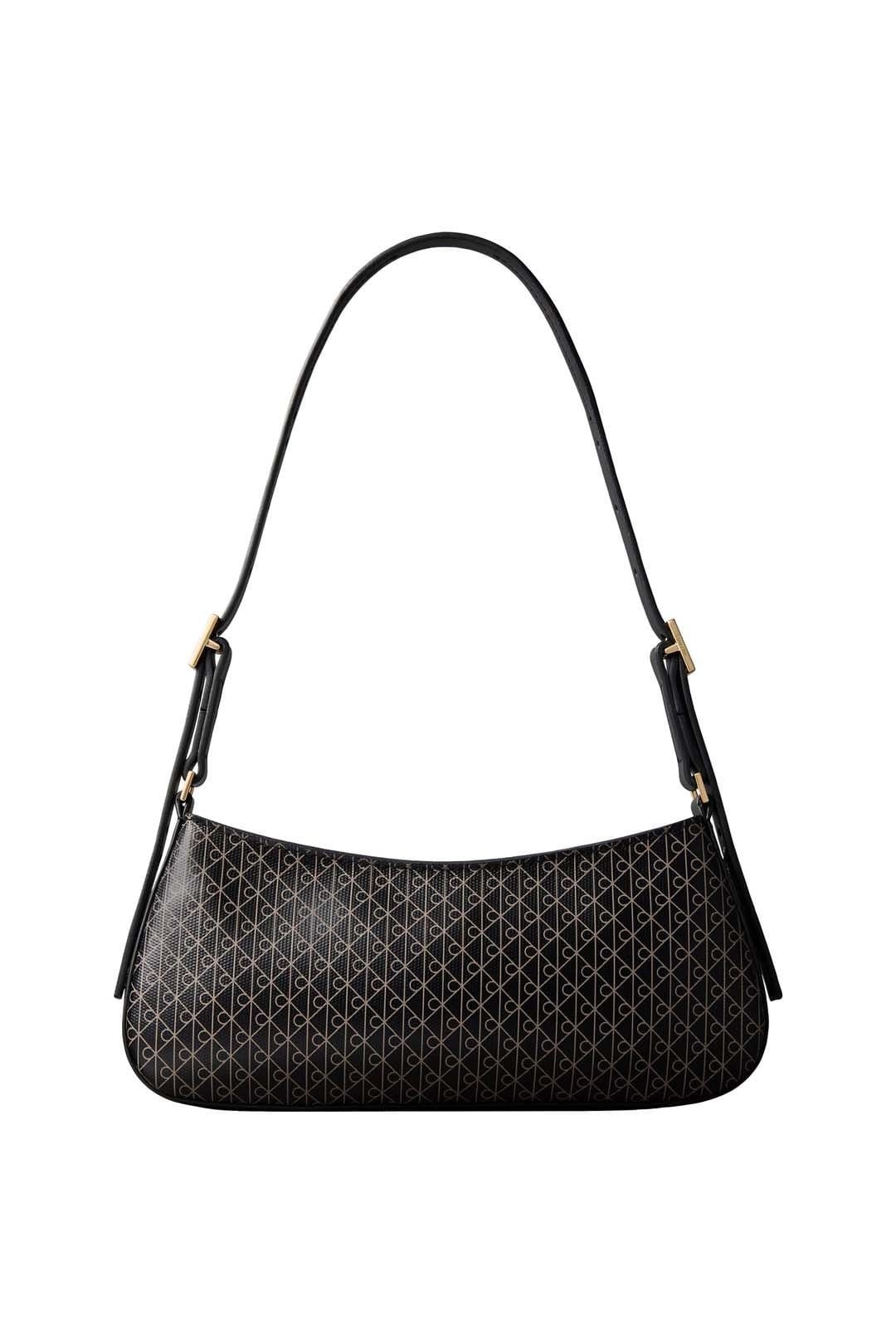 The Calvin Klein Women's Emblem Aop Small Shoulder Bag Black Aop is available in sizes ONE SIZE.