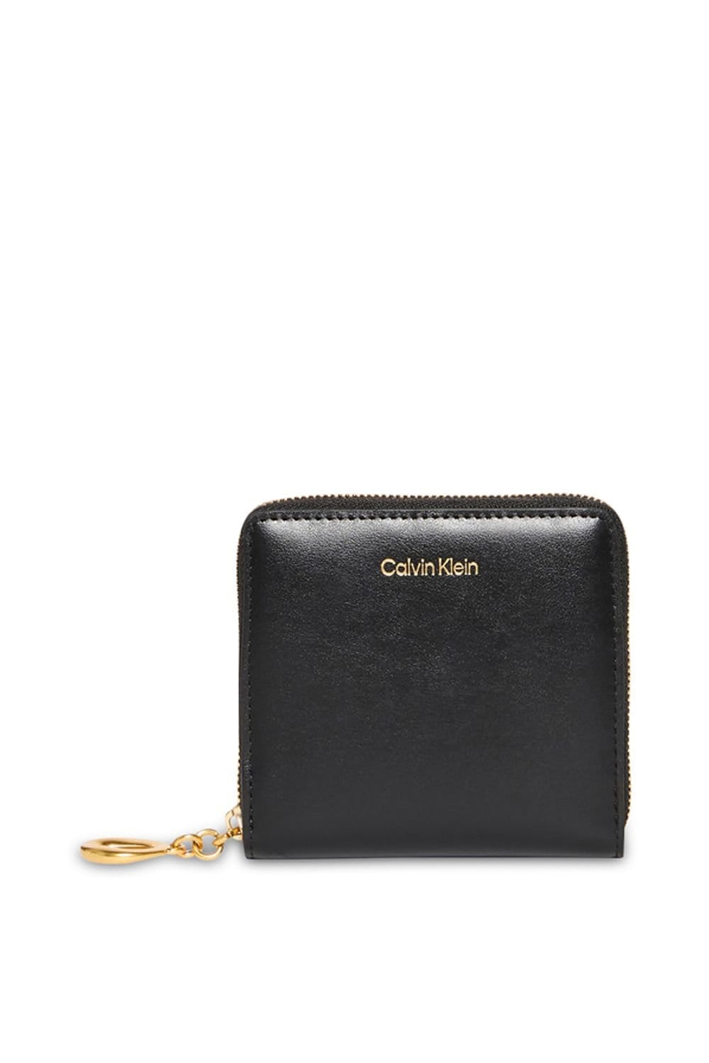 Stylish black leather wallet with a square design and zip-around closure. Features gold-tone hardware and Calvin Klein branding. Multiple card slots and compartments for organised storage.