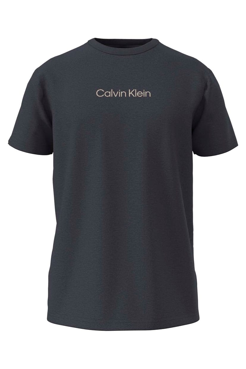 Classic crew neck design for timeless appeal. Short sleeves with clean-finished edges for a refined look. Subtle Calvin Klein logo on chest for understated branding. Versatile dark hue perfect for year-round styling. Relaxed silhouette offering comfortable everyday wear.