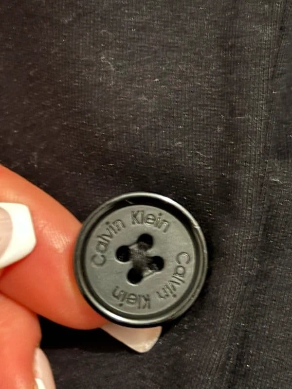 Stylish Calvin Klein black tailored blazer in a sleek, matte fabric. Features a classic lapel collar, single-breasted front, and single vent at the back. Perfect for a polished, professional look.