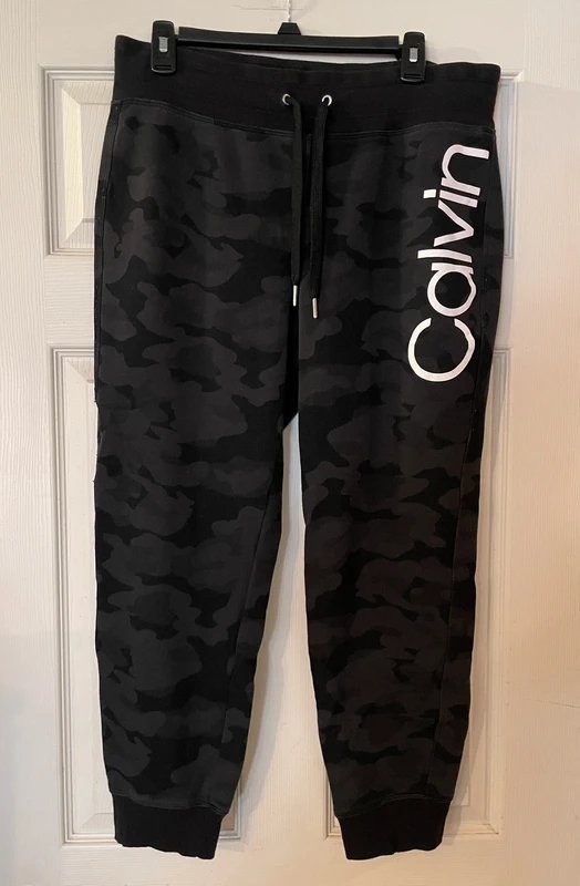 The Calvin Klein Camo Jogger Sweatpants in Black Gray is available in sizes L.