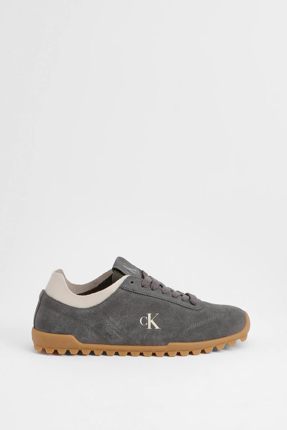 Sleek Calvin Klein Low Profile Runner sneakers in grey with a low profile silhouette. Crafted from genuine leather for durability and comfort, featuring a textured gum sole for excellent grip. The CK logo is subtly embossed on the side, adding a touch of brand identity.