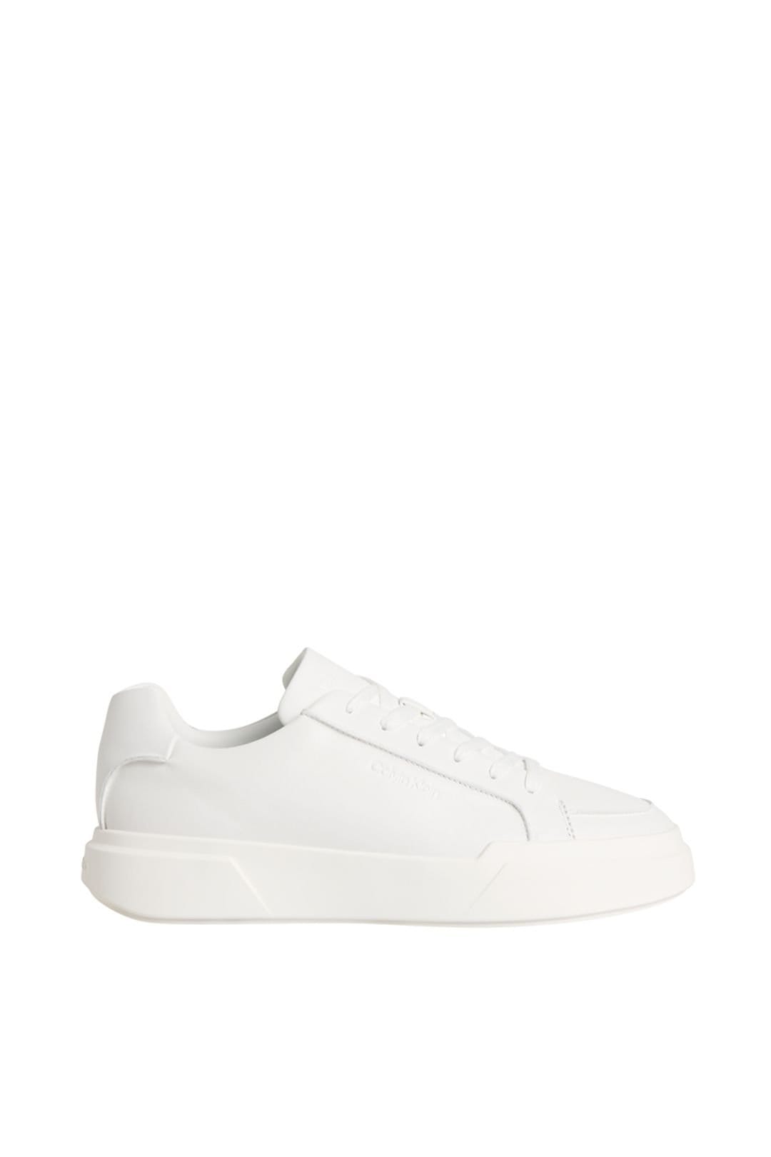 Sleek Calvin Klein men's sneakers in pure white with a chunky cupsole for a bold look. Crafted from genuine leather for durability and comfort, these shoes feature a minimalist design with a traditional lace-up fastening. Ideal for casual and smart-casual outfits.