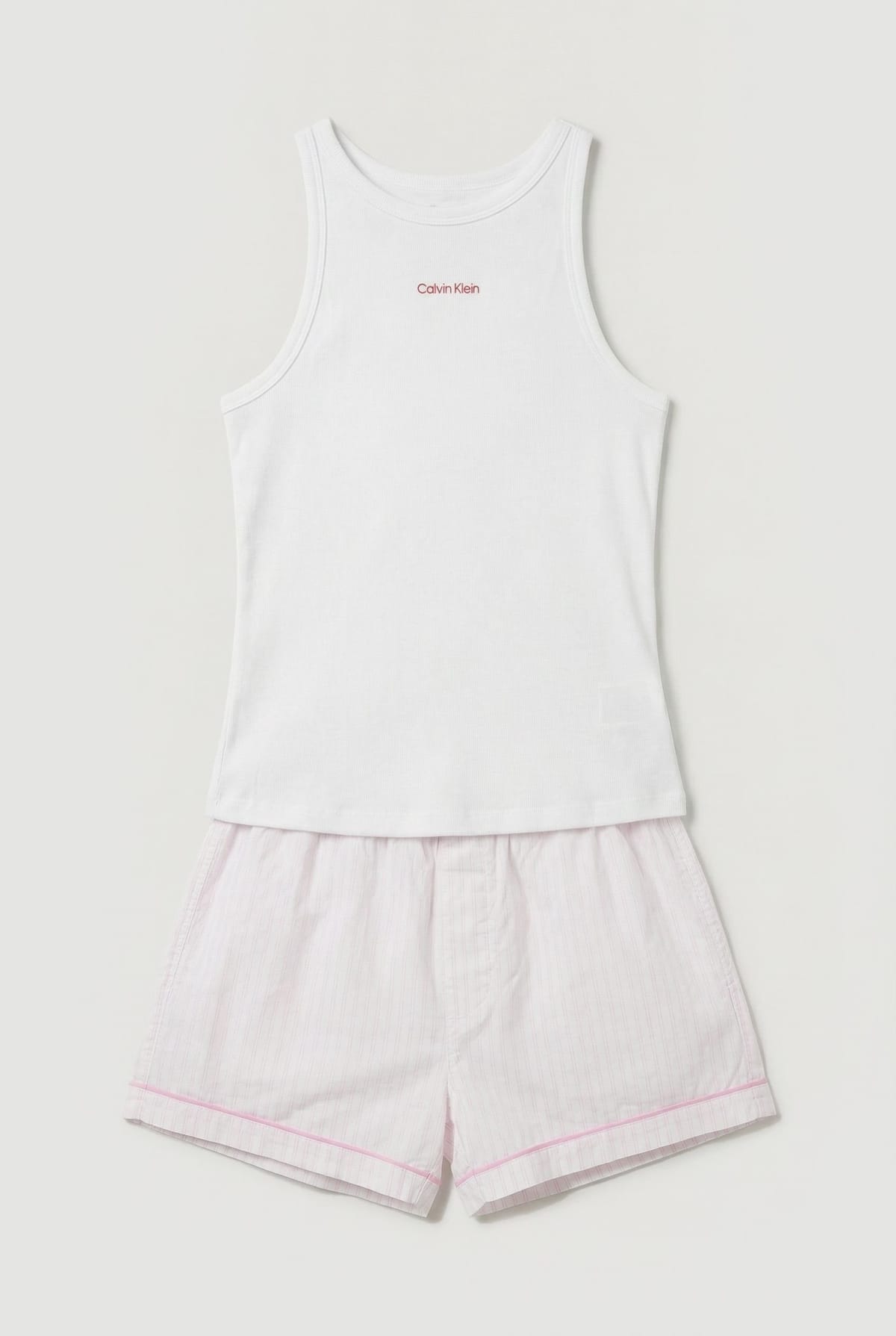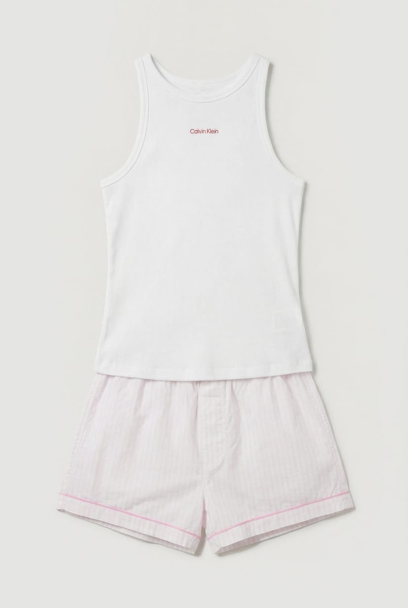 Sleek V-neck tank top with subtle Calvin Klein logo detail. Matching striped shorts with contrast piping for a coordinated look. Soft cotton-rich blend offering excellent breathability. Relaxed fit design for unrestricted movement during sleep. Classic silhouette with contemporary detailing for timeless style.