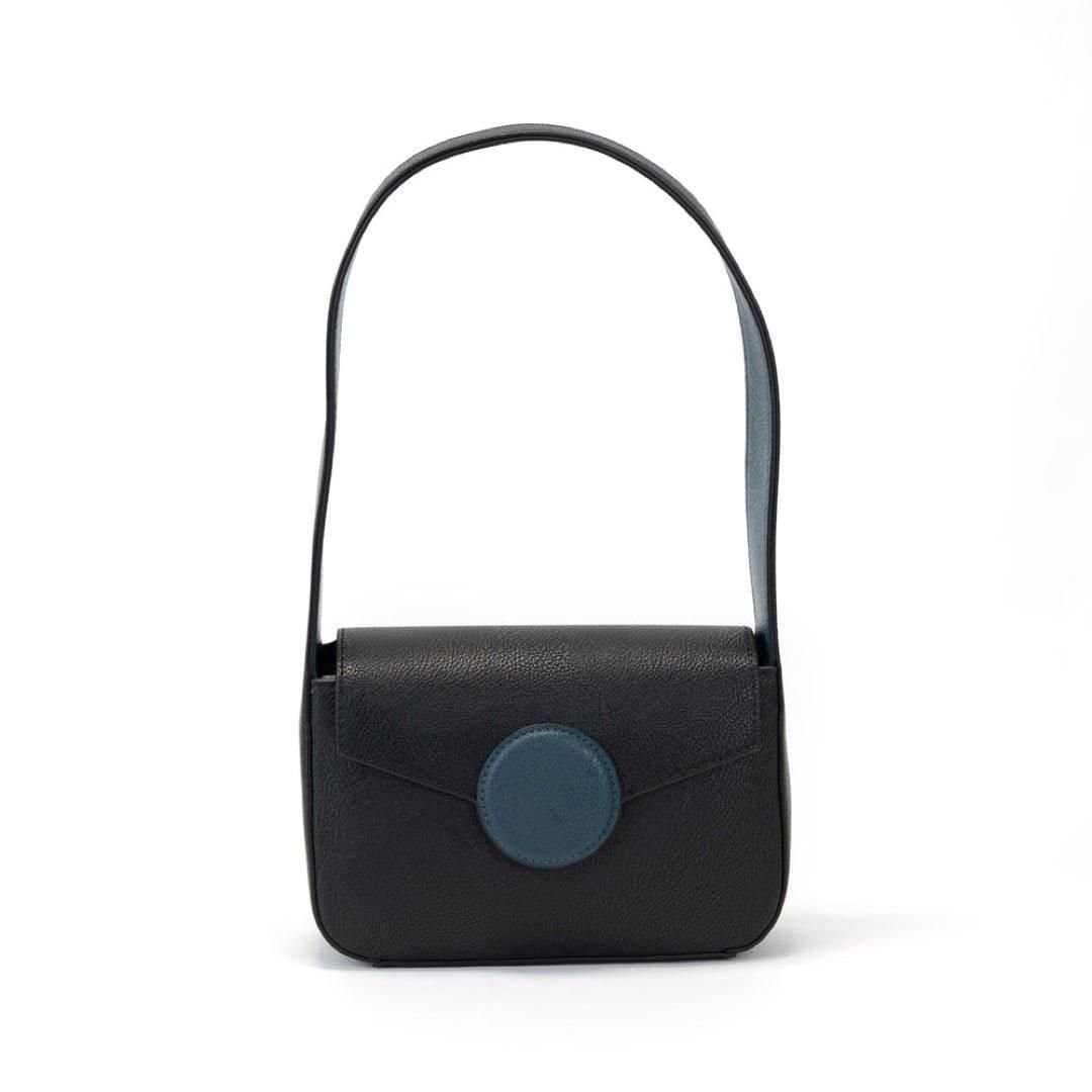 Stylish black leather baguette bag by Campo Marzio. Features a flap closure with a blue circular detail and a detachable strap. Ideal for everyday use and adding a touch of elegance to your look.