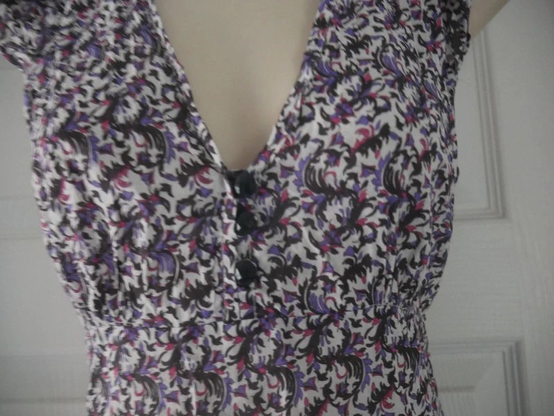 This purple paisley dress is perfect for summer, it is lightweight and slightly sheer. It can be worn on its own, or over a bikini on holiday or as a day dress for the summer. It features capped floaty sleeves and an elasticated ruched detail on the shoulders by the collar. Fastens using a concealed zip at the side.