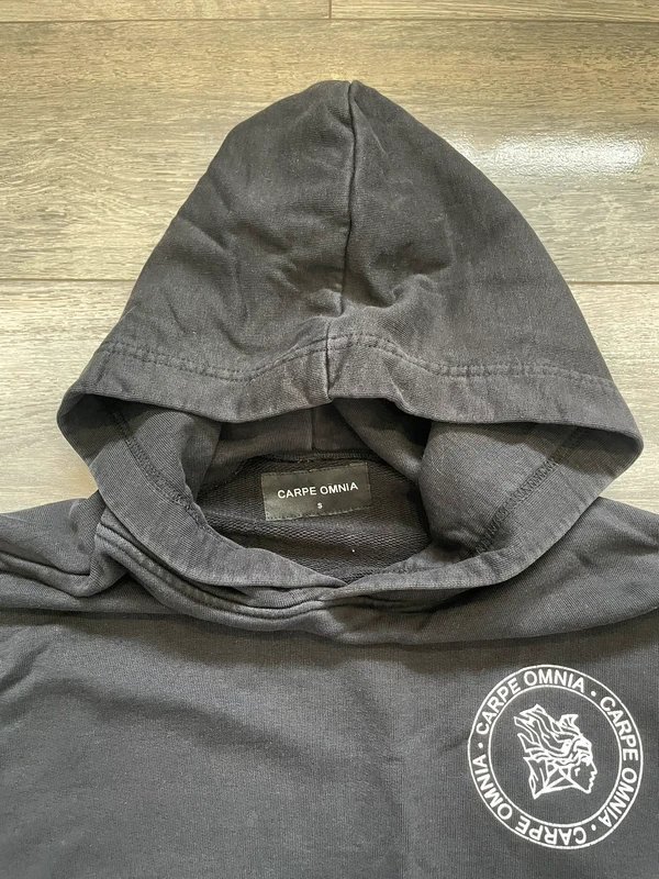 The Carpe Omnia Black Hoodie is available in sizes S.