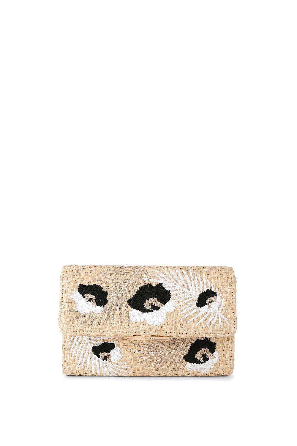 Stylish beige raffia clutch bag by Carvela, adorned with black and white floral embroidery. Features a small gold-tone branded tab on the front flap. Ideal for evening events or casual outings.