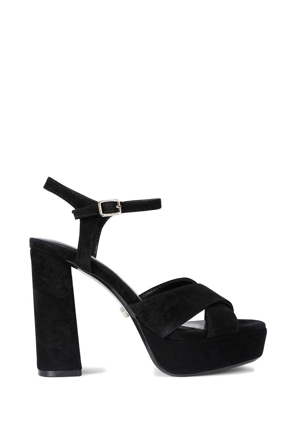 Stylish black suede platform heels by Carvela. Featuring a crisscross strap design and a 11.5cm heel, these shoes add height and elegance to any outfit.