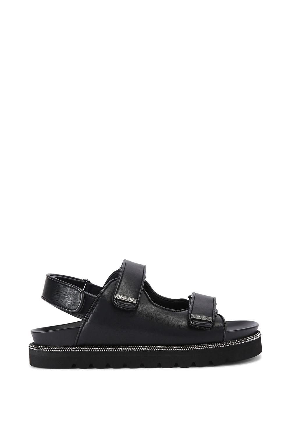 Stylish black sandals with a leather alternative upper. The sandals feature crystal details on the straps and around the footbed, adding a touch of glamour. Perfect for casual outings or evening events.