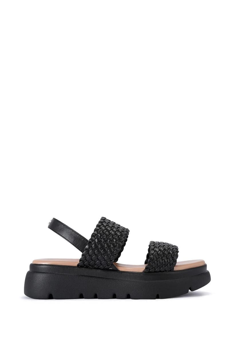 Stylish Carvela Krypton Weave sandals in black leather with two woven straps across the foot and a slingback ankle strap. The chunky sole adds a modern touch, perfect for casual outings.