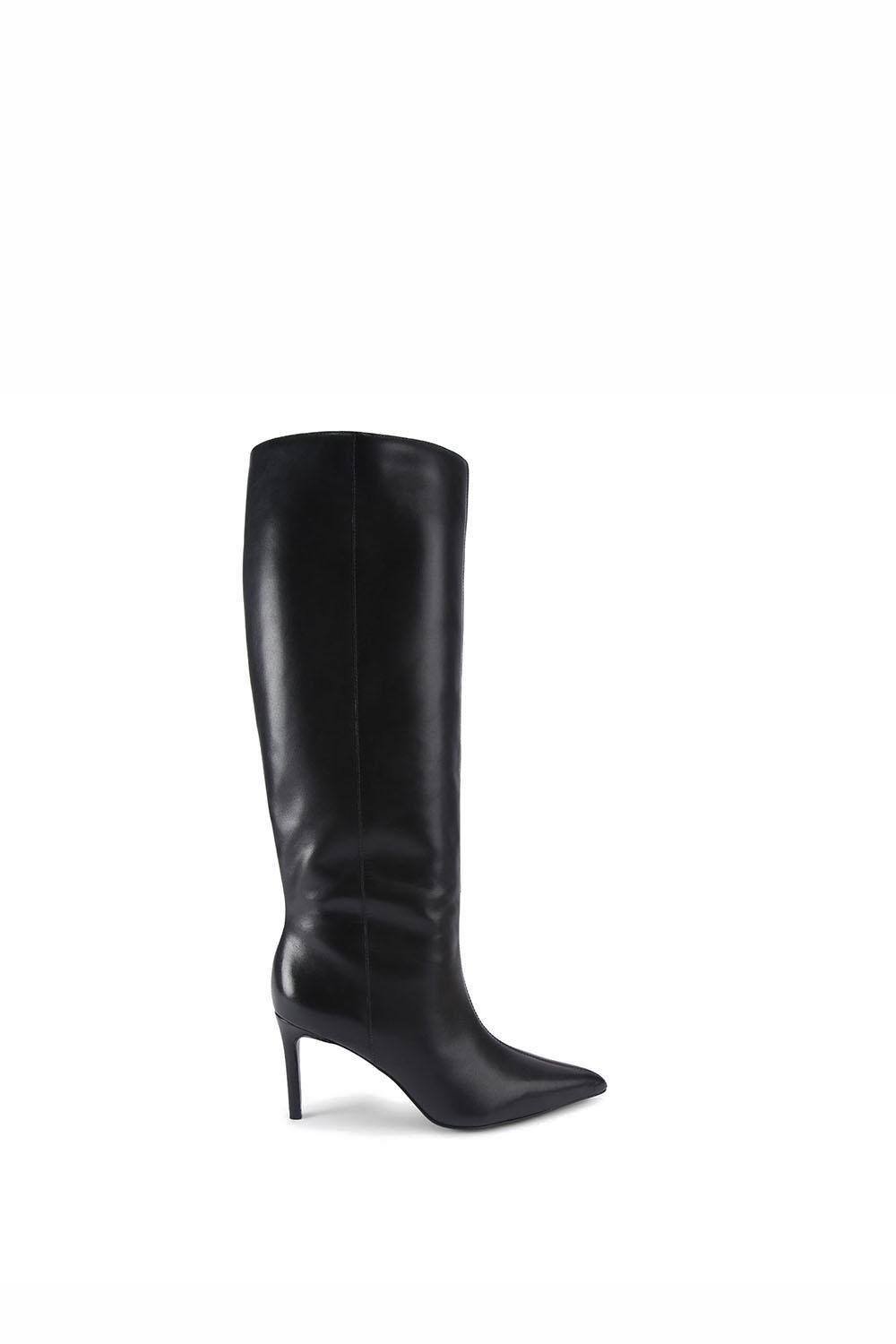 Elegant black leather knee-high boots with a sleek pointed toe and a 10cm stiletto heel. Features a small elasticated panel on the outer side of the ankle shaft for flexibility.