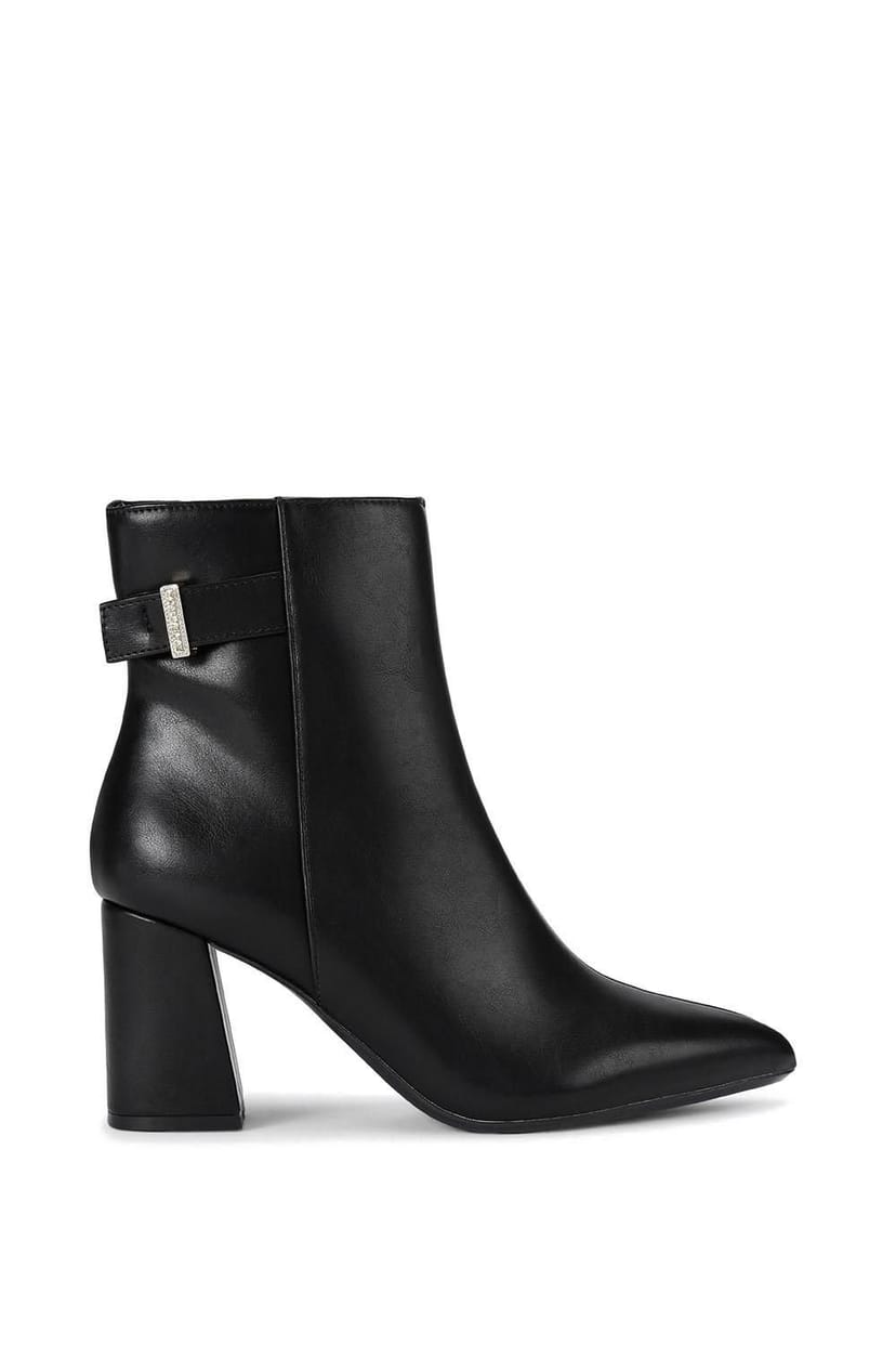 Stylish Carvela ankle boot in black leather alternative. Features a gold branded charm on the ankle strap and a 7.5cm heel. Designed with All Day Long technology for comfort.