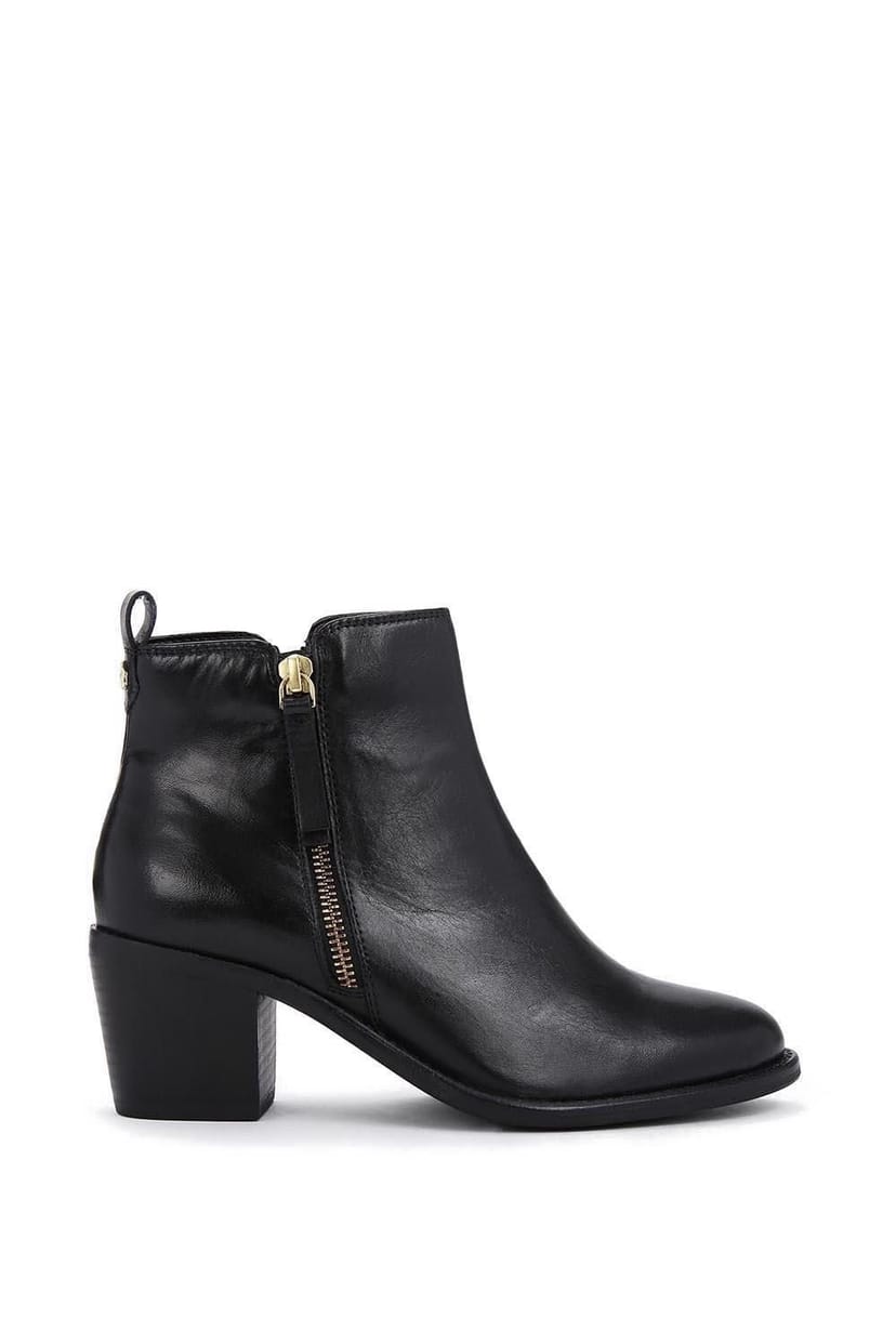Sleek black leather ankle boots with a pointed toe and low block heel. Features two zippers on the outer side for easy wear. Perfect for adding a touch of sophistication to any outfit.