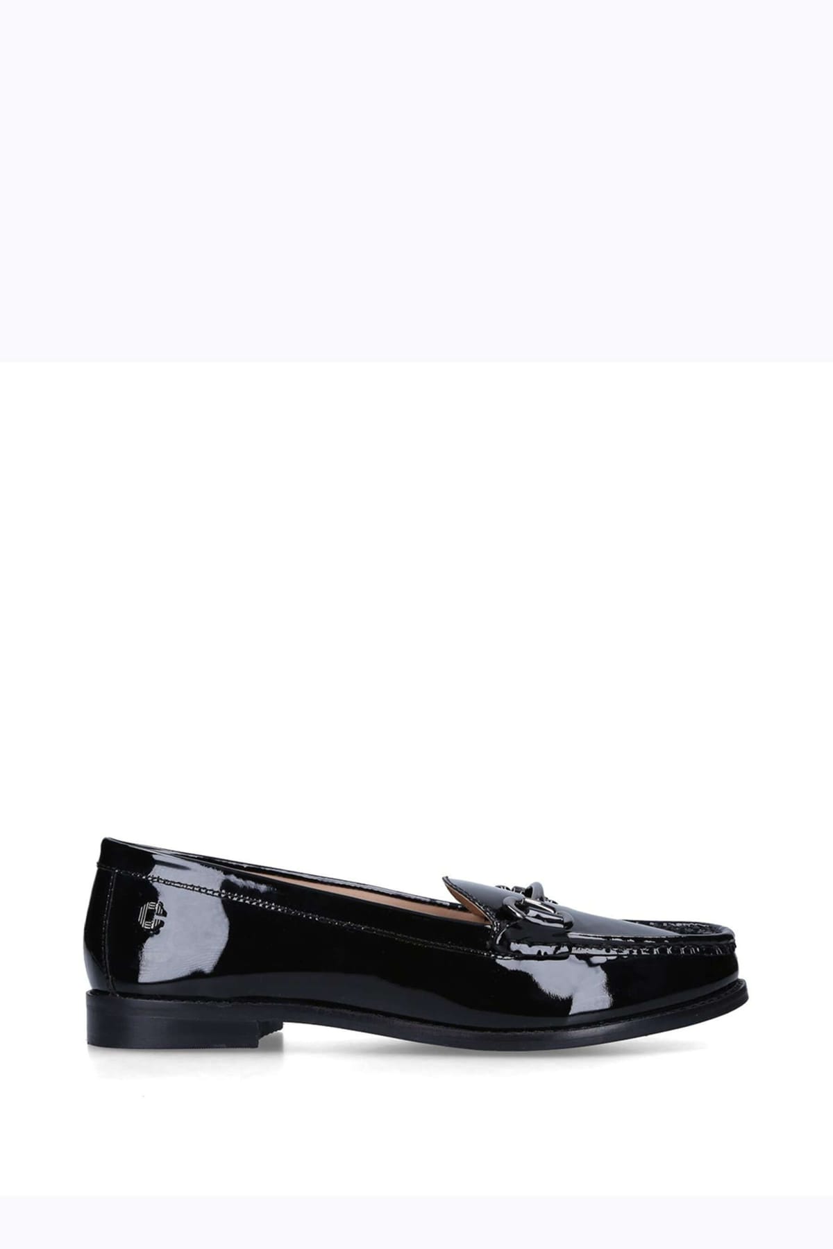 Elegant black patent leather loafers from Carvela featuring a rounded toe and a decorative gold horsebit. Perfect for both casual and formal occasions.