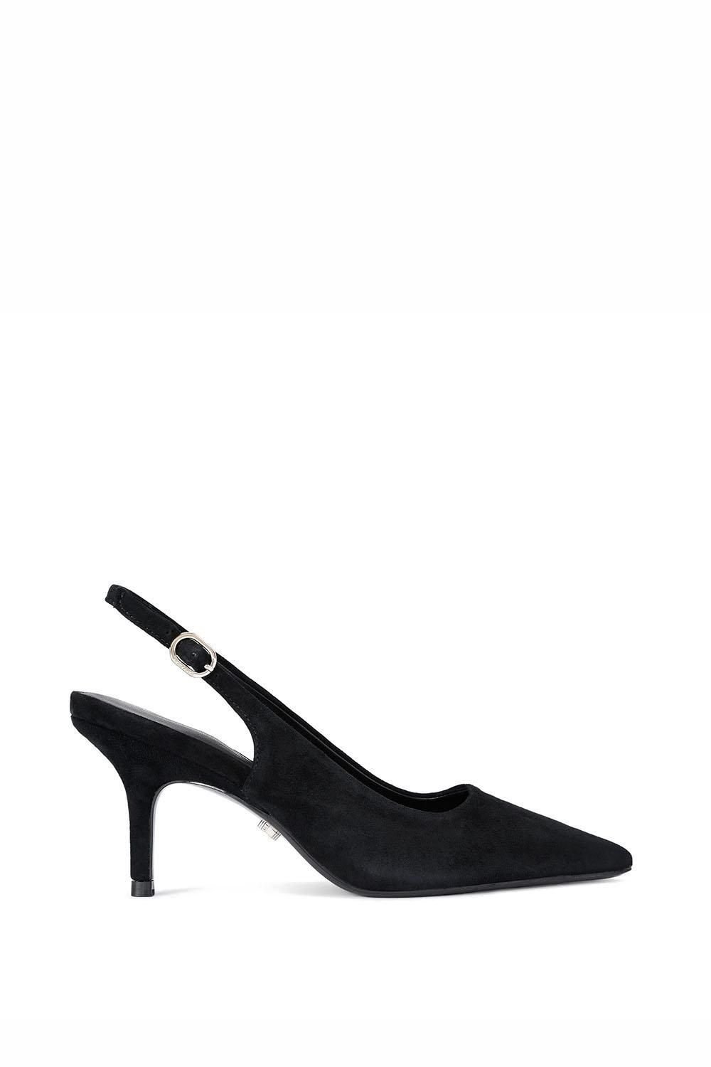 Stylish black suede Carvela Spirited Heel with a pointed toe and slingback ankle strap. The heel height is 8.5cm, offering a sophisticated yet comfortable silhouette.