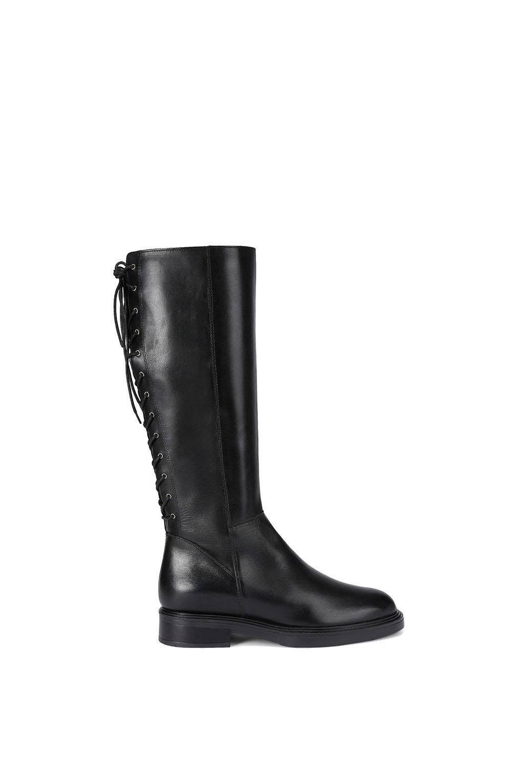 Stylish black leather knee-high boots with a sleek design. Featuring a statement eyelet lace-up detail at the back of the ankle shaft, these boots are perfect for adding an edgy touch to any outfit.