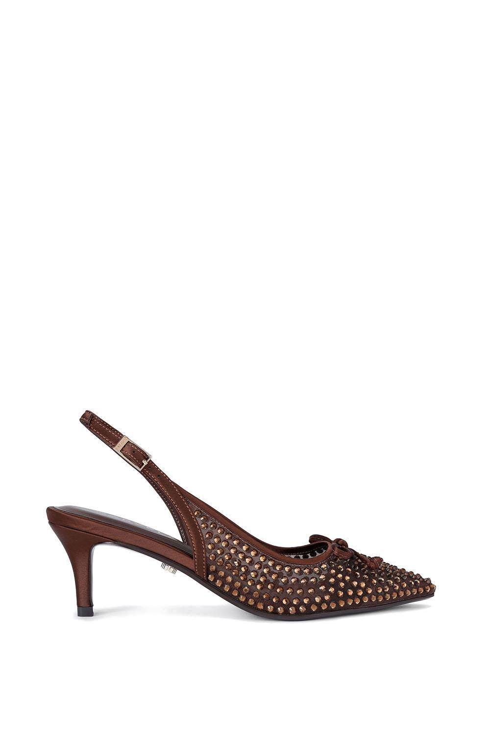 Stylish Carvela Positano Sling Low Jewel fabric heels in brown mesh with crystal embellishments. Features a 7cm heel and a gold tone buckle ankle strap. Designed with All Day Long technology for comfort.