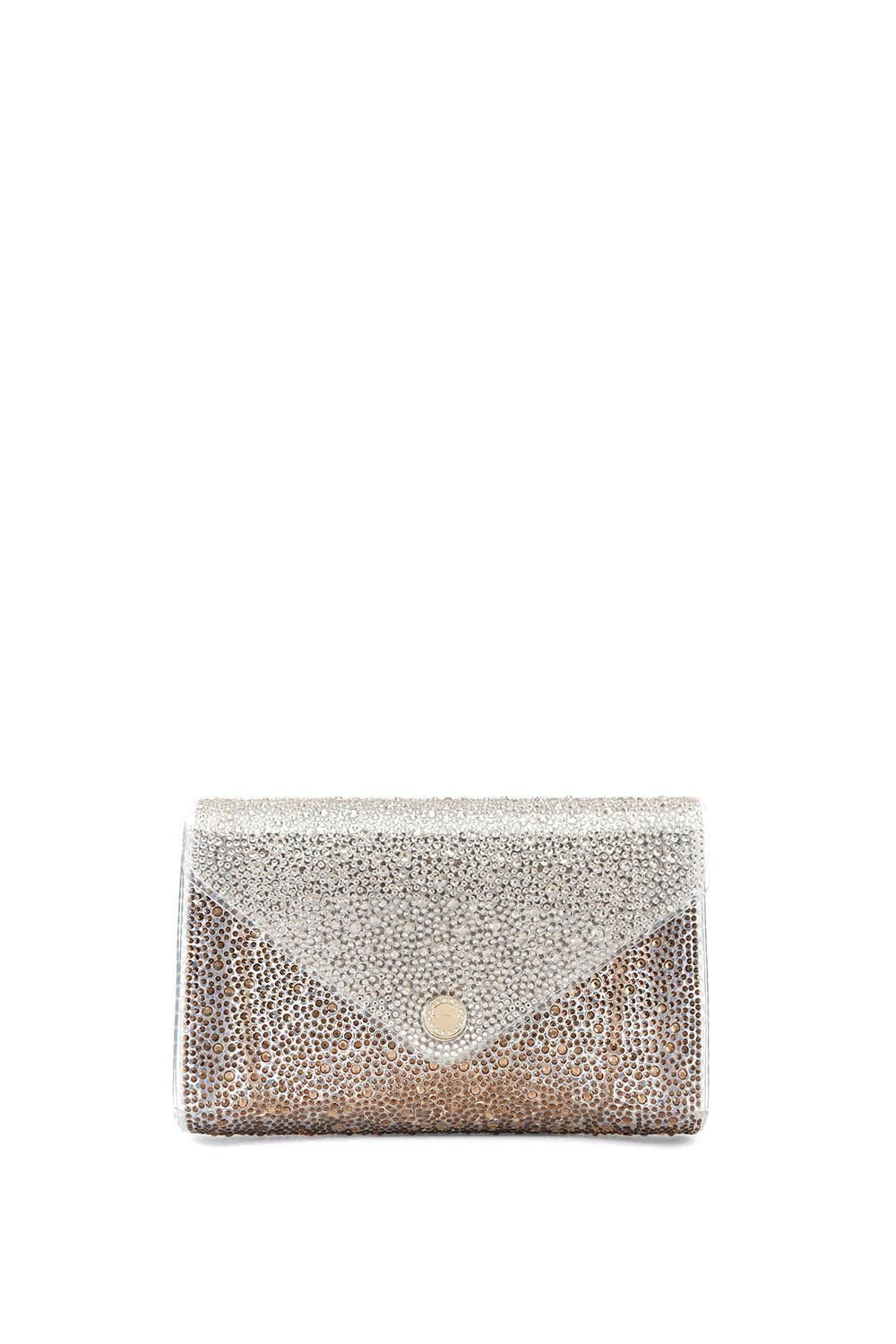 This clutch bag from Carvela is crafted from clear vinyl, embellished with ombre brown crystals. It features a gold round stud on the front flap and a magnetic snap closure. Ideal for evening events or special occasions.