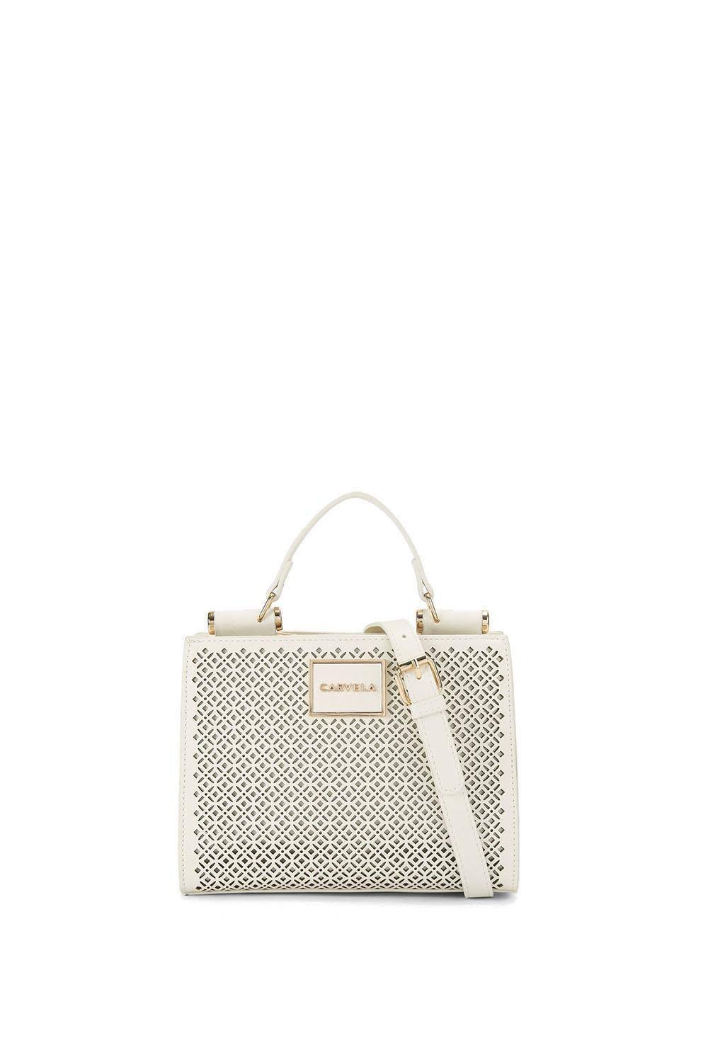 Chic Carvela mini handbag in cream with an intricate laser-cut design. Crafted from synthetic material, this structured bag adds a contemporary touch to your accessory collection.
