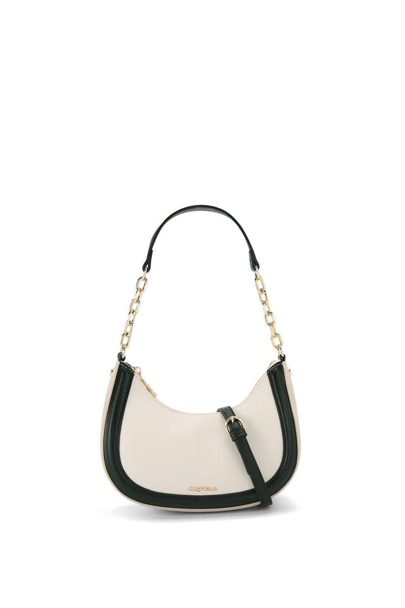Stylish Carvela 'Minori Scoop Shoulder' Bag in cream with black leather alternative panels. Features gold hardware and a detachable chain strap. Perfect for everyday use with a zipped closure.