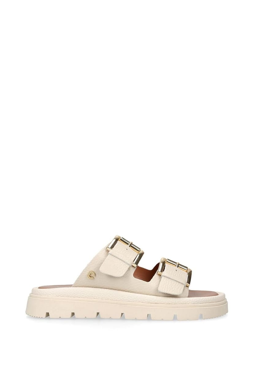 Stylish Carvela Pavilion sandals in cream leather with two adjustable side straps. Features gold-tone buckles and a chunky platform sole for added comfort and style. Ideal for casual outings.