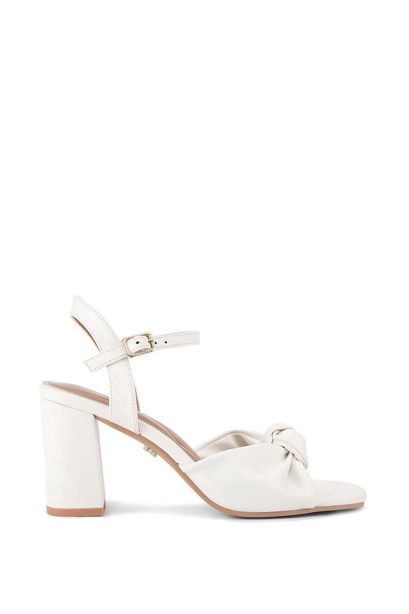 Stylish Carvela Selene sandals in cream featuring a bone leather alternative upper with a knot detail on the toe strap. The block heel adds a subtle height of 3cm. Ideal for elegant occasions.