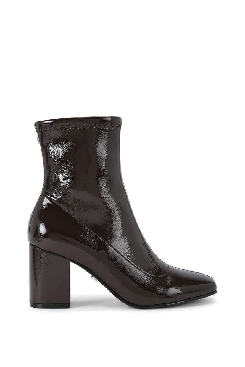 The Carvela Women's 'Strut Ankle' Boots in Dark Brown is made from patent leather.