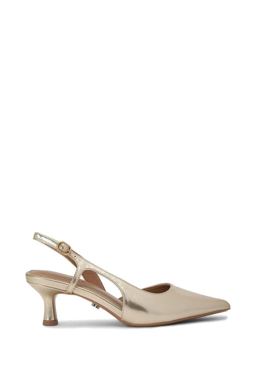 Elegant gold slingback heels with a pointed toe and cut-outs on the sides. The gold buckle adds a touch of sophistication. Perfect for evening events or special occasions.