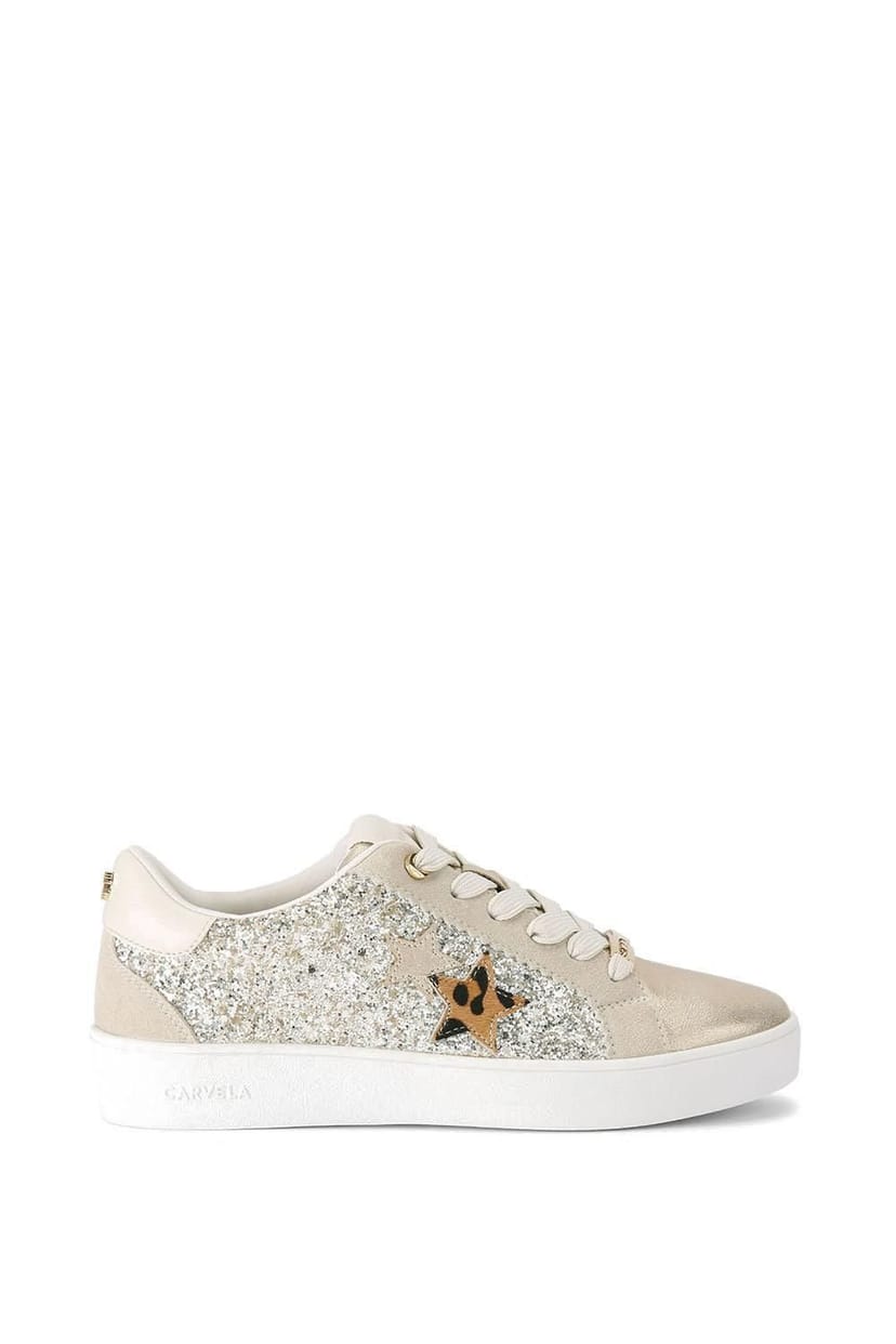 These Carvela trainers feature a metallic gold leather alternative upper with statement textured glitter side panels in silver. The shoes have gold tone branding details and a star design on the side.