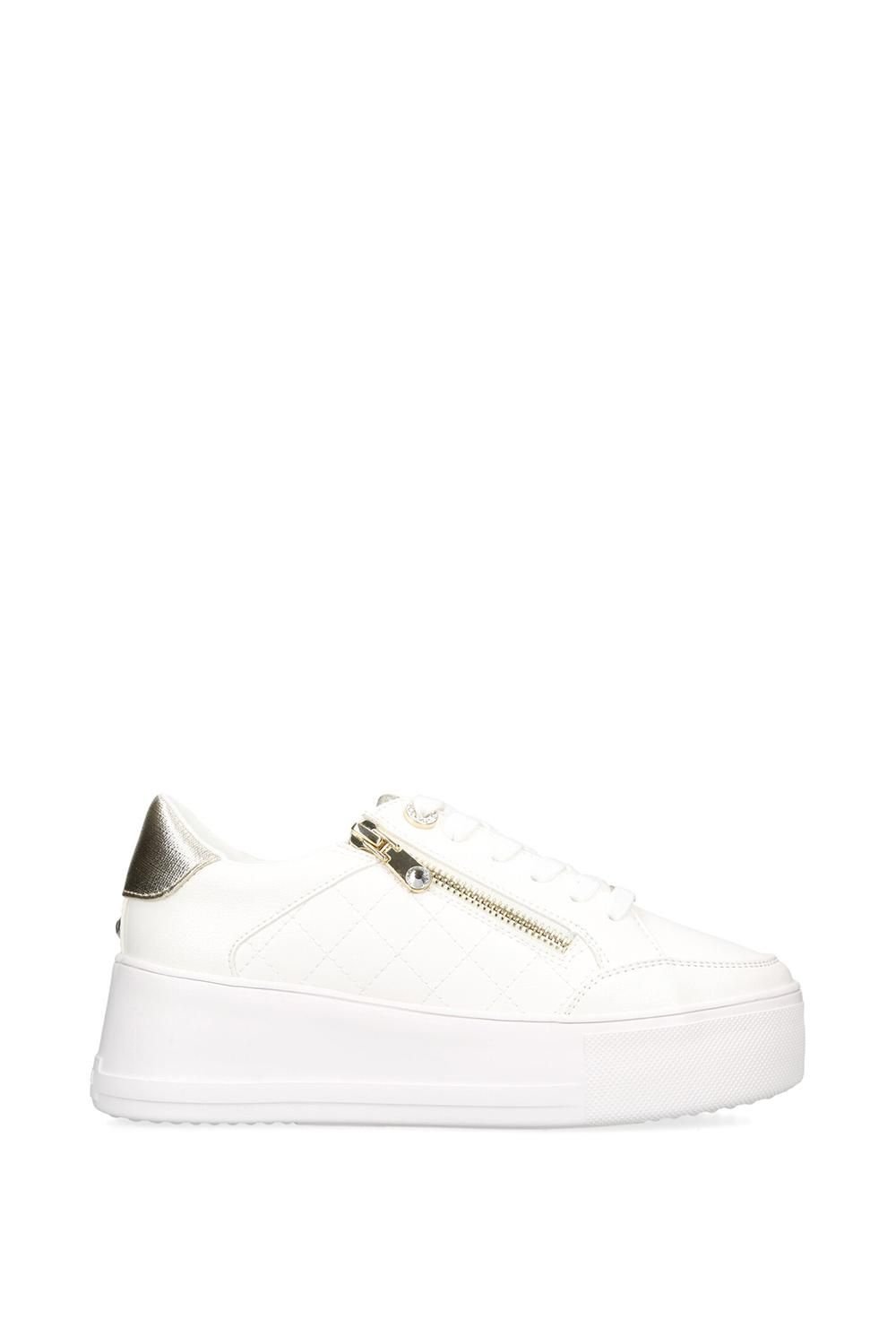 Stylish Carvela Jive Zip trainers in white with gold panels on the tongue and heel. The front laces up with a working gold zip closure at the side. Embellished with crystals, these trainers offer a 50mm sole height.