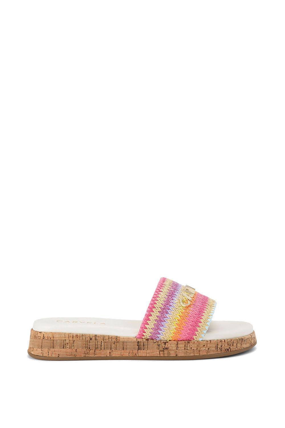 Vibrant multicolor fabric flats by Carvela featuring a sunset stripe woven strap across the foot with gold branding detail on top. The sole has a cork effect and a height of 3.5cm. Designed with All Day Long technology for comfort.