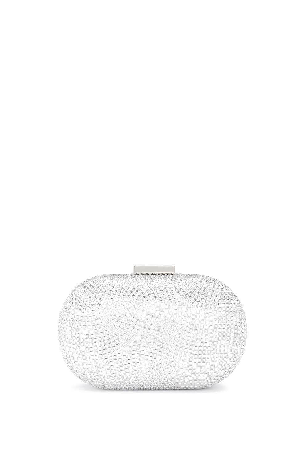 This Carvela clutch bag is a structured pill shape in grey satin fabric with silver studded embellishment across the exterior. It features a silver clasp closure. Ideal for evening events or special occasions.