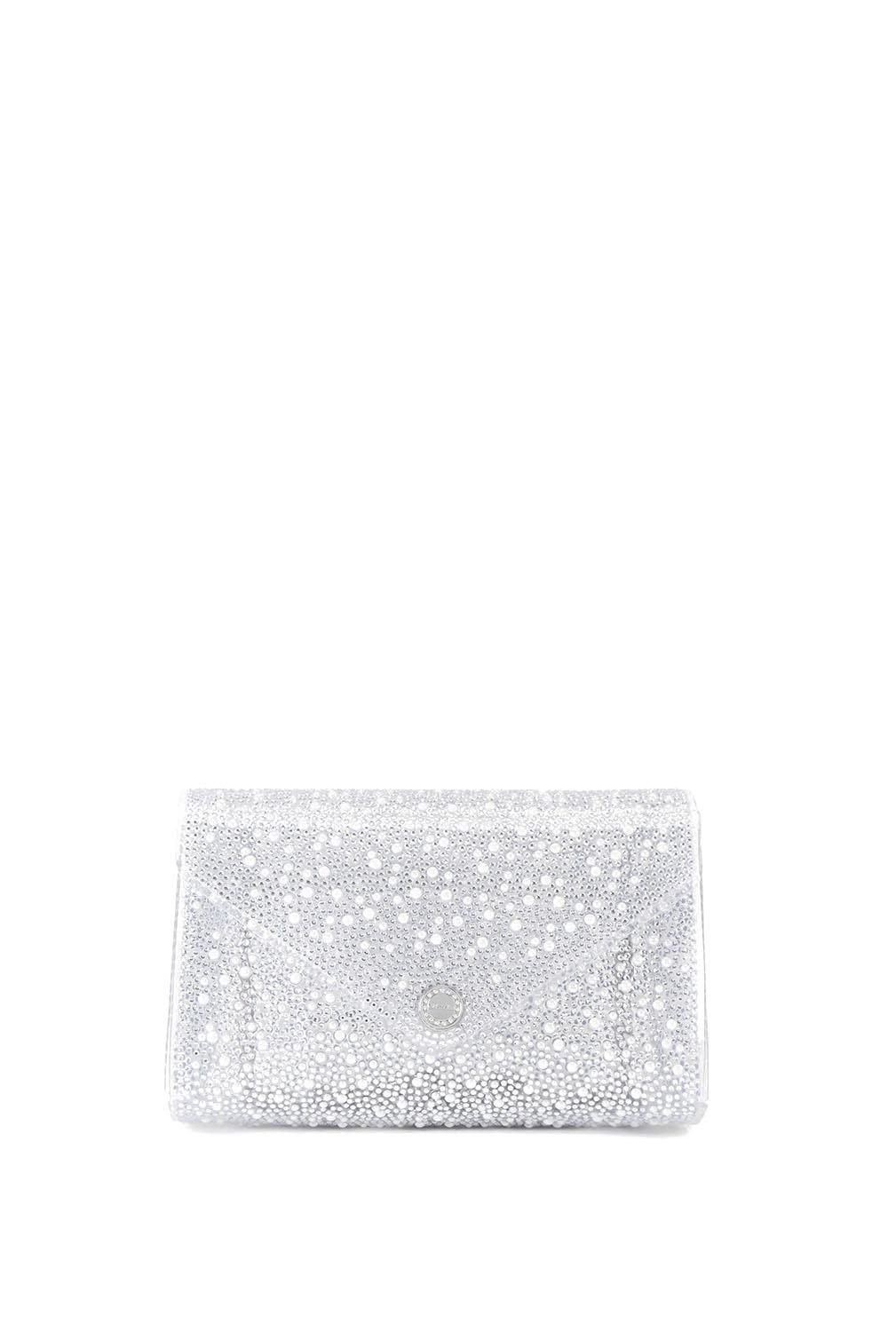 The Carvela White Pearl Embellished Vinyl Clutch Bag is made from vinyl, crystal, silver.