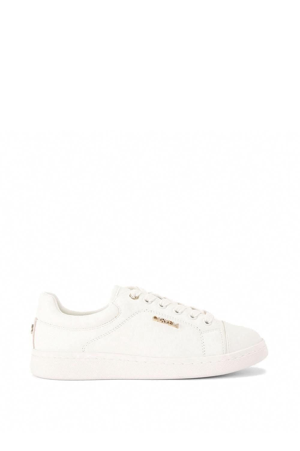 Stylish Carvela Soara trainers in white crafted from a textured leather alternative. The front laces up with white eyelets and features gold tone branding details across the upper. Perfect for casual wear.